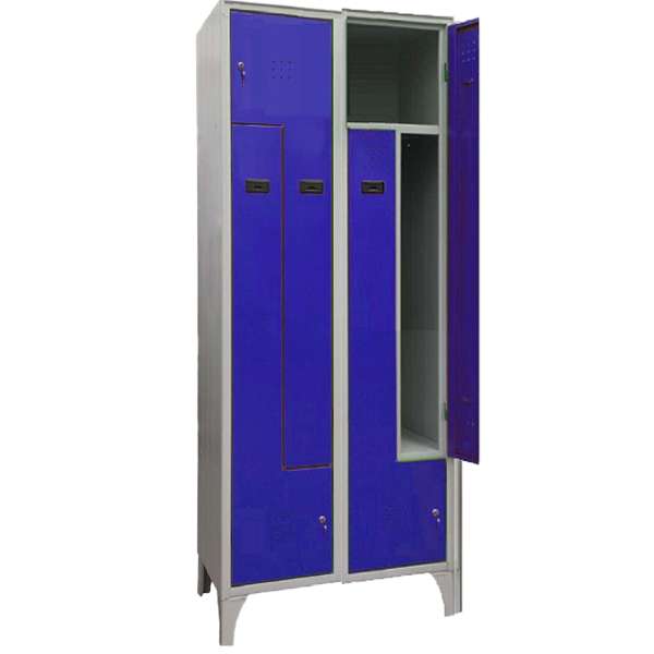 Armadio spogliatoio monoblocco (elettro-puntato non assemblato) su piedi con doppia porta a “L” ogni colonna singola. Struttura portante realizzata in lamiera d’acciaio profilata prima scelta spessore 6/10. N. 2 ante contrapposte per colonna volte ad ottimizzare lo spazio, dotate di canottatura di rinforzo, di fori di aerazione e porta cartellino in materiale plastico. Vano calzature diviso da vano vestiario (maggior igiene). Cerniere interne speciali antiscasso con perno di rotazione interno invisibile ad anta chiusa. Bordo frontale perimetrale arrotondato anti urto raggio mm 6. Nervature longitudinali su fianchi. Asole sul tetto per consentire un’ottima circolazione dell’aria. Trattamento delle superfici: a mezzo fosfato di ferro pesante come preparazione alla verniciatura che avviene per elettrodeposizione anodica con spessore garantito in ogni parte del mobile. Reticolazione a forno a 180°. Vernici: acriliche con elevata resistenza alla corrosione secondo le norme A.S.T.M.B. 117.64 e succ.var DIMENSIONI cm: 80 X 50 X 195 H Peso: kg 43 Volume: mc. 0,78 Vani 8 – ripartizione interna del mobile per colonna: 1 ripiano a tutta larghezza 1 tramezzo divisorio centrale 1 ripiano inferiore a tutta larghezza Tubo ovale in PVC completo di ganci scorrevoli Porta cartellino in materiale plastico applicato all’anta Colore corpo: GRIGIO RAL 7035 Colore ante: BLU RAL 5017 Serratura a cilindro con doppia chiave in dotazione. – 717/2P/L/SRAL5017