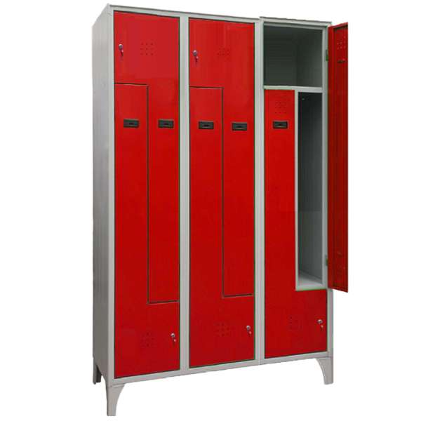 Armadio spogliatoio monoblocco (elettro-puntato non assemblato) su piedi con doppia porta a “L” ogni colonna singola. Struttura portante realizzata in lamiera d’acciaio profilata prima scelta spessore 6/10. N. 2 ante contrapposte per colonna volte ad ottimizzare lo spazio, dotate di canottatura di rinforzo, di fori di aerazione e porta cartellino in materiale plastico. Vano calzature diviso da vano vestiario (maggior igiene). Cerniere interne speciali antiscasso con perno di rotazione interno invisibile ad anta chiusa. Bordo frontale perimetrale arrotondato anti urto raggio mm 6.Nervature longitudinali su fianchi. Asole sul tetto per consentire un’ottima circolazione dell’aria. Trattamento delle superfici: a mezzo fosfato di ferro pesante come preparazione alla verniciatura che avviene per elettrodeposizione anodica con spessore garantito in ogni parte del mobile. Reticolazione a forno a 180°. Vernici: acriliche con elevata resistenza alla corrosione secondo le norme A.S.T.M.B. 117.64 e succ.var. DIMENSIONI cm: 120 X 50 X 195 H Peso: kg 62 Volume: mc. 1,17 Vani 12 – ripartizione interna del mobile per colonna: 1 ripiano a tutta larghezza 1 tramezzo divisorio centrale 1 ripiano inferiore a tutta larghezza Tubo ovale in PVC completo di ganci scorrevoli Porta cartellino in materiale plastico applicato all’anta Colore corpo: GRIGIO RAL 7035 Colore ante: ROSSO RAL 3000 Serratura a cilindro con doppia chiave in dotazione – 717/3P/L/SRAL3000