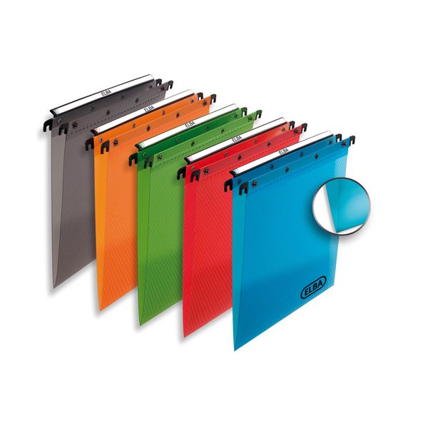 Cartelle sospese per cassetto in polipropilene traslucido trasparente in 4 colori. Resistenza massima anche grazie al sistema di fissaggio rinforzato e al collegamento con bottoni a pressione.