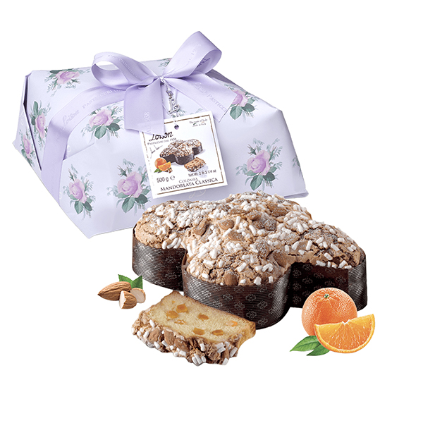La Colomba pasquale classica è un dolce dalla pasta gialla, soffice e ben alveolata, arricchita di scorze di arance di Sicilia candite . La superficie è ricoperta con una fragrante glassa alle mandorle italiane e decorata con mandorle intere e granella di zucchero. – 842