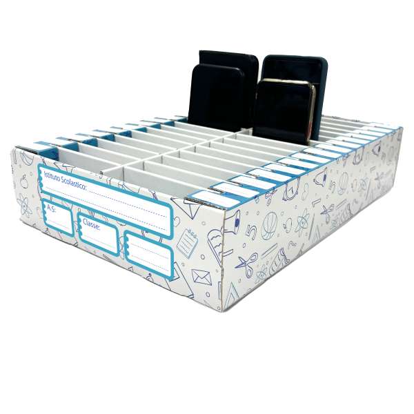 Contenitore portacellulari in cartone ondulato KBMT 264E che risponde alla richiesta delle scuole a seguito della Circolare Ministeriale n. 3392 del 16 giugno 2025 he vieta l’uso dei cellulari, con l’obiettivo di tutelare l’apprendimento e ridurre le distrazioni in classe. Dimensioni: mm 265 x 385 x 80 Peso: 563 gr Alloggiamenti n°: 30 – 020EXPOTEL/S