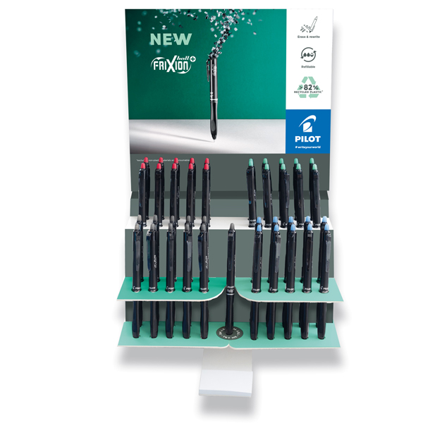 Espositore da banco con 40+1 Frixion Ball+. Penna realizzata con almeno l’82% di plastica riciclata (escluso i refill e componenti non plastici). Colori assortiti: nero, blu, rosso e verde. – 010165