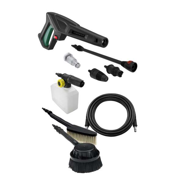 Idropulitrice in alluminio a tre pistoni in acciaio ad alta resistenza con valvola by-pass incorporata. Vano portaccessori e supporto porta cavo elettrico. Automatic stop system. Tubo ad alta pressione con attacchi rapidi pistola e ingresso pompa. Sistema schiumogeno regolabile e testina alta pressione Variojet con getto regolabile spillo/ventaglio. Testina turbo. Maniglia inferiore per trasporto. Lavasuperfici da esterno. Impugnatura telescopica. Potenza: 2500WPressione: 180 bar max Dimensioni: 78/95 x 39 x 36cm – 36063-00089