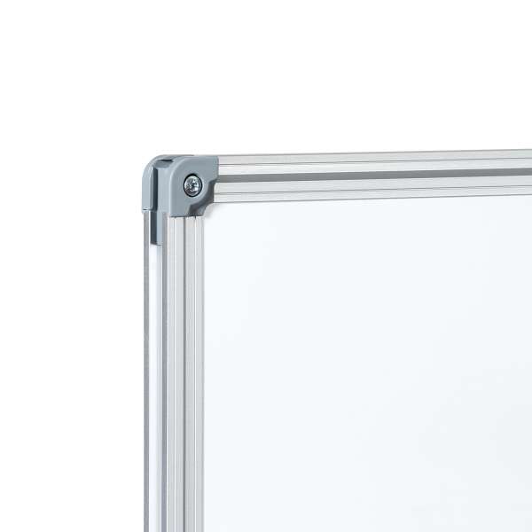 Lavagna bianca con superficie in acciaio laccato, magnetica, scrivibile e cancellabile con marcatori a secco. Robusta cornice in alluminio estruso di alta qualità con angoli in plastica per la massima stabilità. Completa di vassoio porta accessori da 30cm e kit di montaggio.