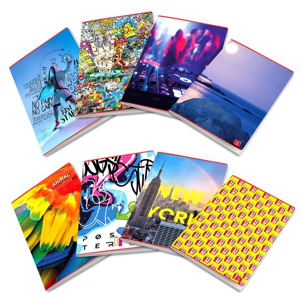 Maxiquaderno rilegato con punto metallico. Copertina in cartoncino da 205gr verniciatura UV. Risguardo personalizzabile stampato fronte e retro. Fantasie assortite 2023. – 02326001R
