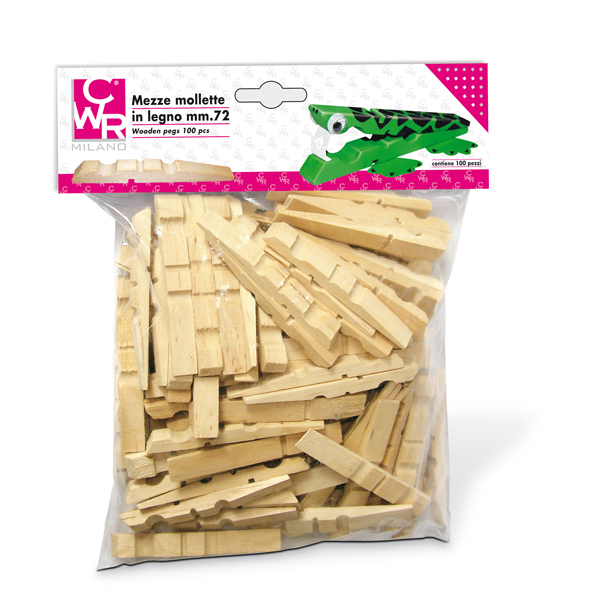 Mezze mollette in legno. Uno dei più tradizionali strumenti didattici per realizzare originali lavori da dipingere. Particolarmente indicati per sviluppare la fantasia del bambino. Sacchetto da 100 pezzi da 72mm. – 1719