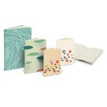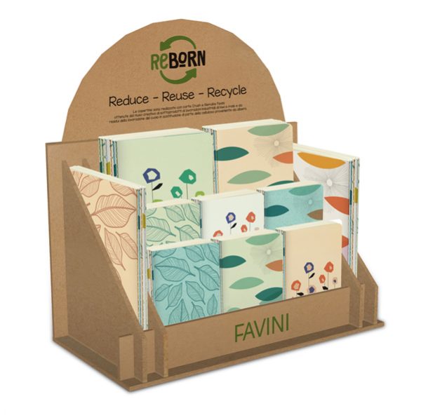 Display con 50 notebook rilegati in formati e fantasie assortiti, realizzati interamente in carta riciclata: 30 x f.to A6, 12 x f.to A5, 8 x f.to B5 – G99X999