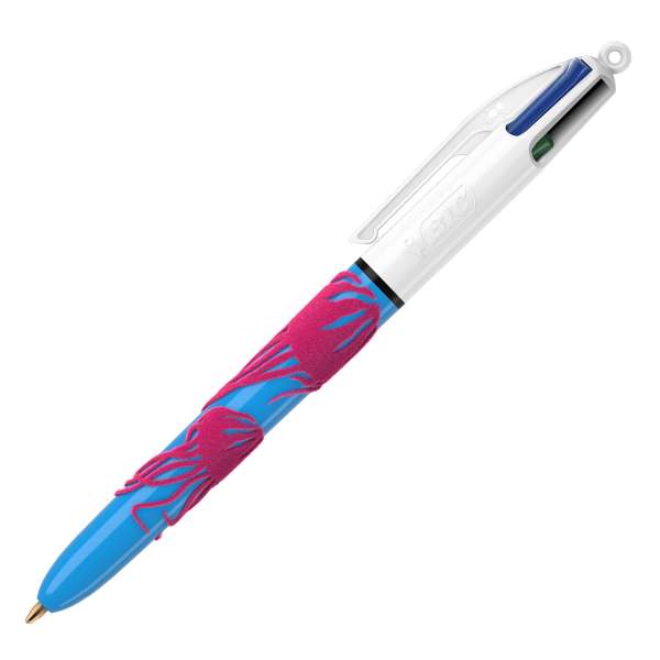 Espositore con assortimento di 60 penne a sfera BIC 4 Colours Velours con fusti ricoperti da un’esclusiva decorazione in velluto morbido al tatto in 3 temi assortiti: granchi, meduse e tartarughe. – 996794