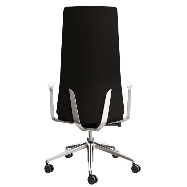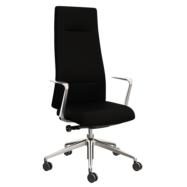 Poltrona direzionale imbottita. Elevazione a gas, contatto permanente, meccanismo synchro multiblock schienale con ritorno controllato, con 4 blocchi antishock, traslatore sedile. Gas certificato TUV; EN 1335 C 2020. Portata massima 140kg. Braccioli inclsi fissi in alluminio. Base alluminio. Dimensioni: Altezza totale: 121-133cm; Profondità: 70cm; Altezza seduta da terra: 45-56cm; Larghezza sedile: 53cm (62cm con braccioli); Profondità sedile: 46-54cm; Altezza schienale: 75cm; Larghezza schienale: 50cm; Altezza braccioli da terra: 64-75cm; Base Ø 70cm. – BUA/KN