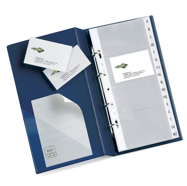 Porta biglietti da visita in COLPAN 2000® (cartone rivestito in PVC espanso) con 4 anelli tondi da 16mm, rubrica alfabetica e 20 buste da 8 tasche in PP liscio con foratura universale rinforzata. Adatti alla raccolta di 160 biglietti da visita. – 57091707