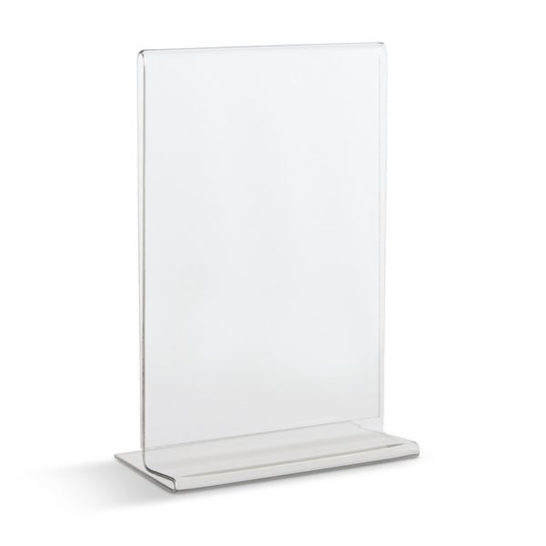 Display in PET trasparente (materiale riciclabile) idoneo al contatto con gli alimenti. Ottima resistenza agli urti e al fuoco. Ideale per ogni tipo di comunicazione e perfetto come porta menù o porta listino. Portadepliant con base a T formato A6 – 10,5x15cm – spessore 1,0mm. – 80996