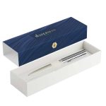 Penna a sfera con corpo bianco e meccanismo a rotazione in acciaio. Fornita con refill blu. – 2174517