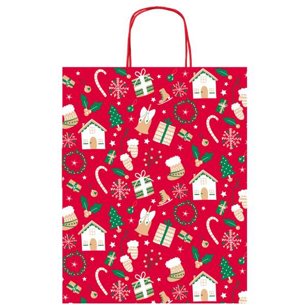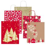 Shopper regalo realizzato in carta kraft bianco con stampe a colori. Dotato di manici in carta ritorta. Assortimento di 5 differente fantasie natalizie. – SDX26000NAT