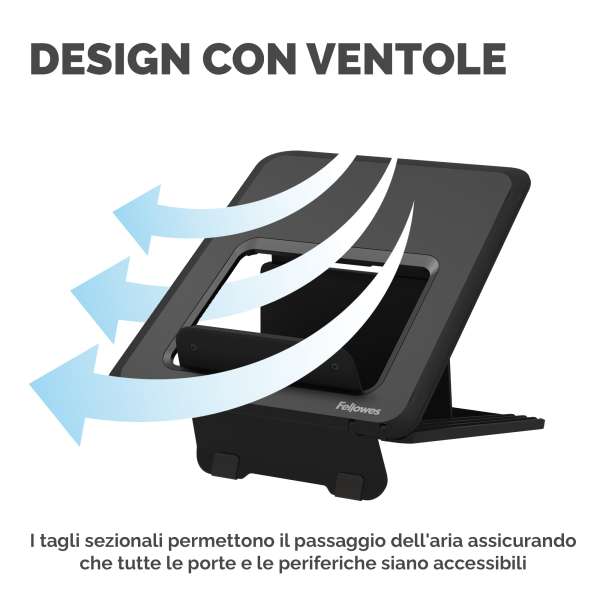 Dodici regolazioni di altezza con gambe frontali ripiegabili per ottimizzare la posizione dello schermo di qualunque laptop.Sostiene laptop fino a 14’’ e di peso massimo di 4kg.Materiali 100% riciclabili e con garanzia limitata 5 anni.Dimensioni prodotto;1.40 x 23.50 x 26.80 – 100016558