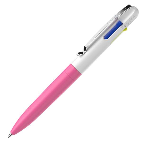 Penna a sfera a quattro colori. Scrive in . Cambio scrittura rapido e agevole grazie ai pulsanti colorati.Realizzata per il 92% in plastica riciclata. Con tecnologia Viscoglide per una scrittura straordinariamente fluida e scorrevole.Punta M. Inchiostro indelibe c onforme alla norma ISO12757-2. Dotata di robusto clip in metallo. Fusto in quattro nuovi colori neon con diversi colori di scrittura (nero, blu, giallo + verde chiaro, arancione o rosa). – P307212