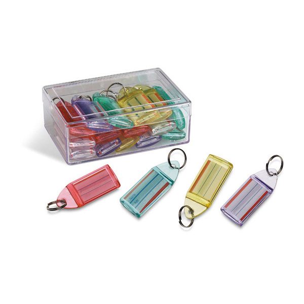 Scatola in plastica trasparente con 15 targhette portachiavi in plastica con anello in metallo. Colori assortiti trasparenti per una facile identificazione da ambo i lati. – P-3