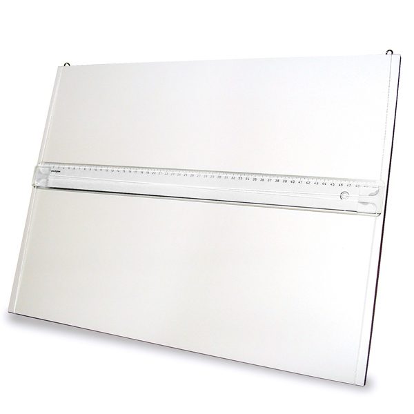 Tavoletta per disegno con leggio formato 50x73cm. Tavoletta in truciolato di con lamina in formica bianca. Fornita con riga da 70cm munita di guscette. Scorrimento della riga su binari di filo. – 070M
