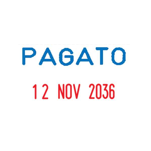 Timbro mini datario con dicitura fissa PAGATO con caratteri alti 4mm. Fusto antiurto in ABS. Tampone preinchiostrato bicolore blu/rosso (cod 38126). Tampone ricambio nero E/10 (cod 38117). – S160/L1