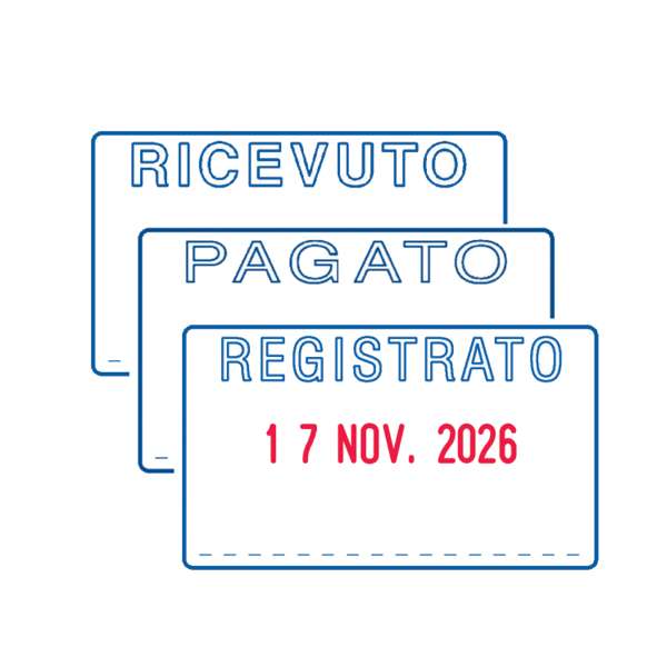 Datario autoinchiostrante per uso professionale con 3 testi intercambiabili: RICEVUTO, PAGATO, REGISTRATO. Altezza caratteri 4 mm. Impronta bicolore. Tampone ricambio 6/50/2 – 131659
