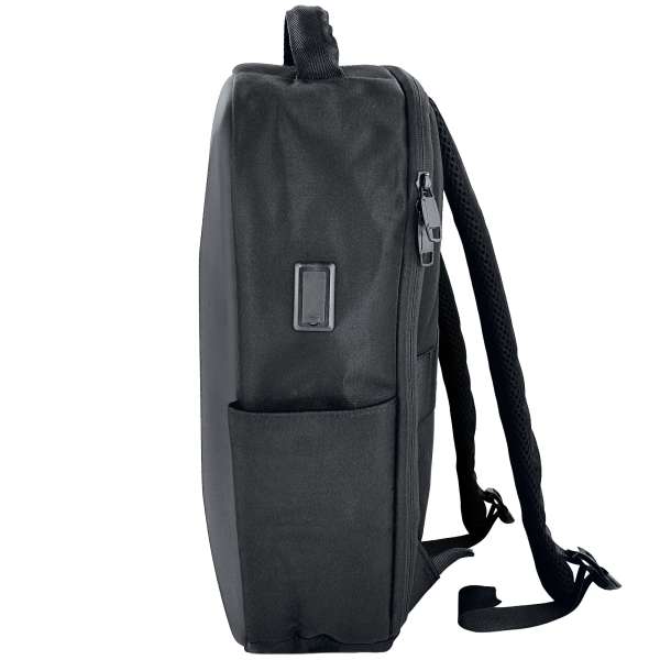 Zaino unico scomparto in tessuto con fronte rigido in ABS antiurto. Scomparto interno espandibile con tasca imbottita per notebook 15.6″. Retro e spallacci imbottiti traspiranti, regolabili. Fascia posteriore per trolley. Presa Usb e Usb-c per powerbank. Tasca laterale. Dimensioni: 31x42x12cm – 82123